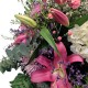 Preciosa composición floral de forma redonda, compuesta de flores en rosa y blanco, tales como: lilium, astromelias, hortensias, etc. y acompañadas por eucaliptos y verdes ornamentales.