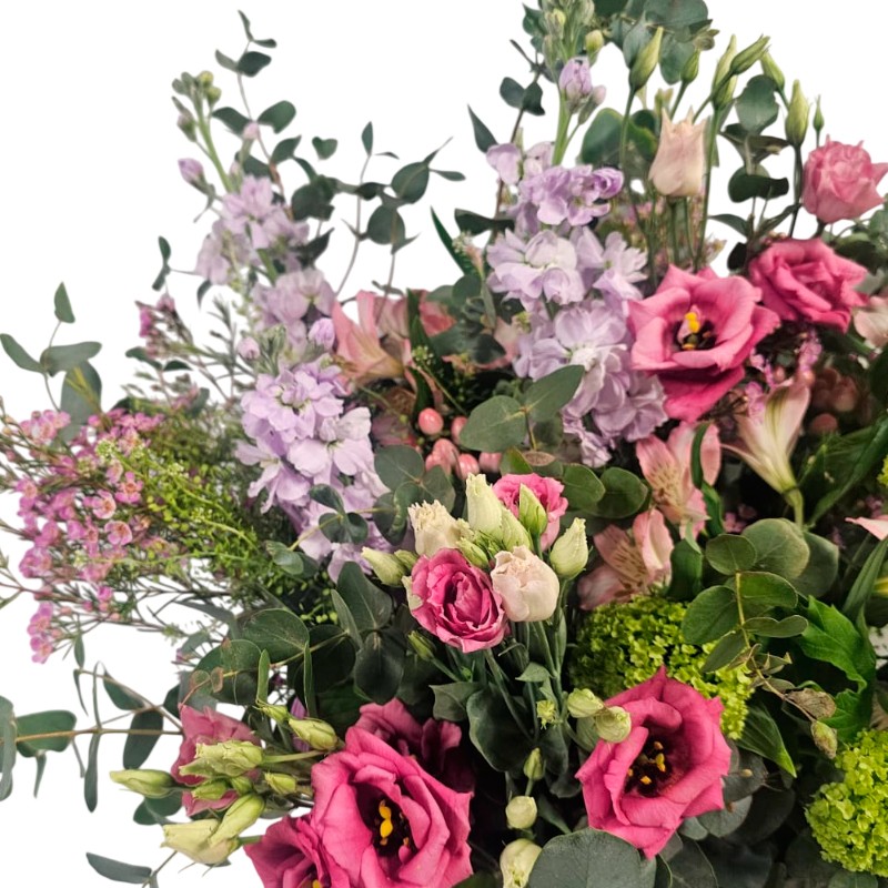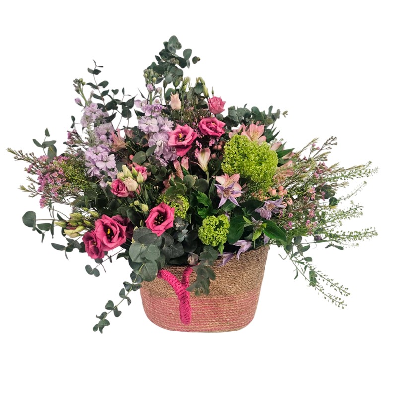 Canasto floral en tonos verdes, rosas y lilas, enriquecido con verdes ornamentales. Una composición fresca y armoniosa que transmite dulzura y serenidad, perfecta para cualquier ocasión especial.