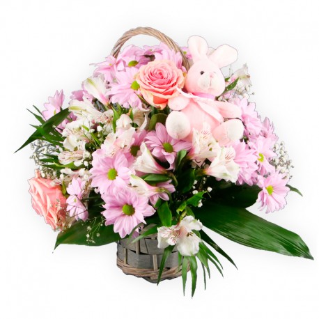 Preciosa cesta en tonos rosas con flores tales como margaritas, rosas, alstromelias, etc. Acompañado de peluche para niña (modelo según stock disponible).
