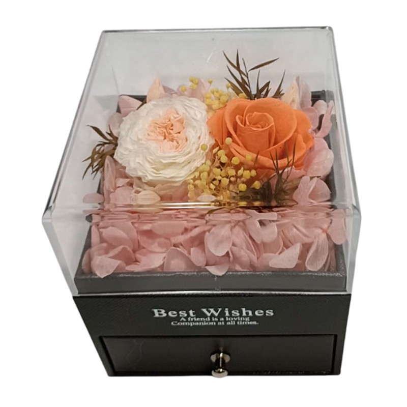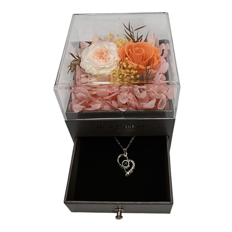 Precioso arreglo de flores preservadas presentada en caja de metacrilato de 10x10 cm, compuesto por rosas, hortensias y paniculata en tonalidades cálidas. El conjunto incorpora un colgante en su interior, constituyendo una propuesta integral diseñada para expresar el amor y el afecto hacia la persona destinataria.