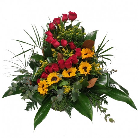 Composición de rosas rojas y girasoles acompañada con diferentes tipos de verdes y solidago. Medidas aproximadas 80x80 cm.