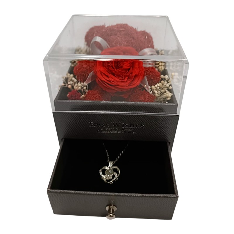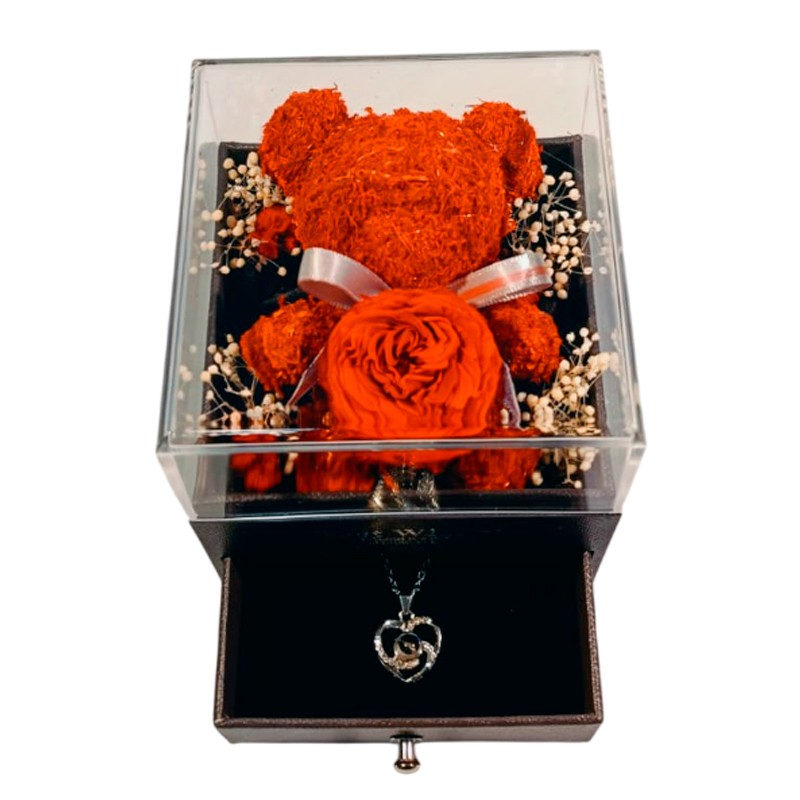 Arreglo floral presentado en caja de metacrilato de 11x11 cm que contiene una figura de oso elaborada en sisal, rematada con una rosa de jardín preservada. El conjunto integra un colgante en su interior, conformando una propuesta de diseño singular orientada a manifestar amor y cariño hacia la persona destinataria.