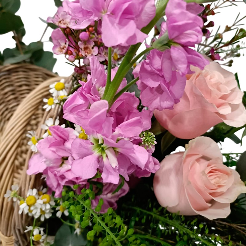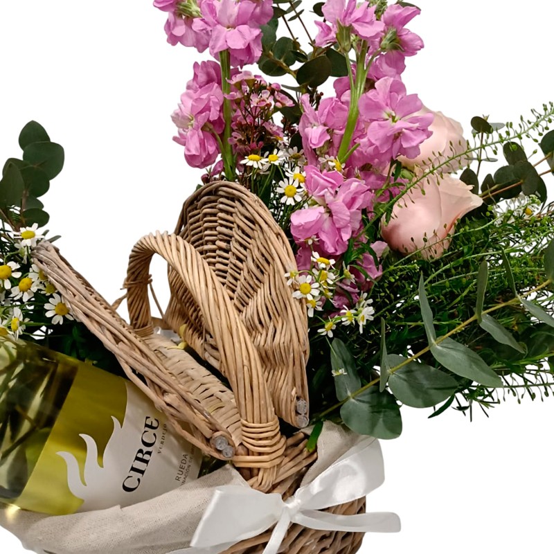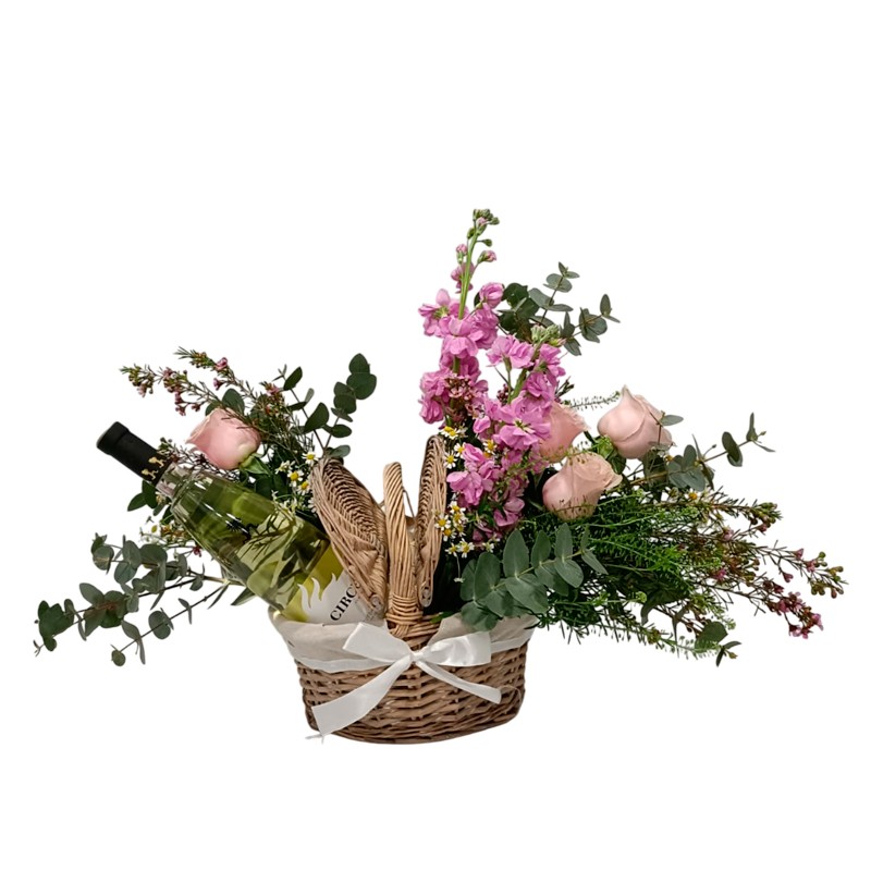 Arreglo floral dispuesto en cesta de picnic, compuesto por alelíes y rosas en tonalidades rosadas junto con follaje ornamental. El conjunto incluye una botella de vino blanco Circe, configurando una propuesta orientada a estimular los sentidos y a manifestar el amor y la estima hacia la persona destinataria.