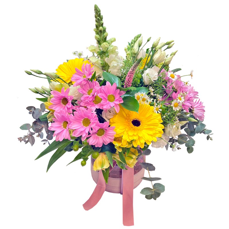 Composición alegre y colorista presentada en jarrón y compuesta por flores en tonos blancos, rosas y amarillos, tales como margaritas, gerberas, lisiantum, etc. y diferentes tipos de verdes variados.