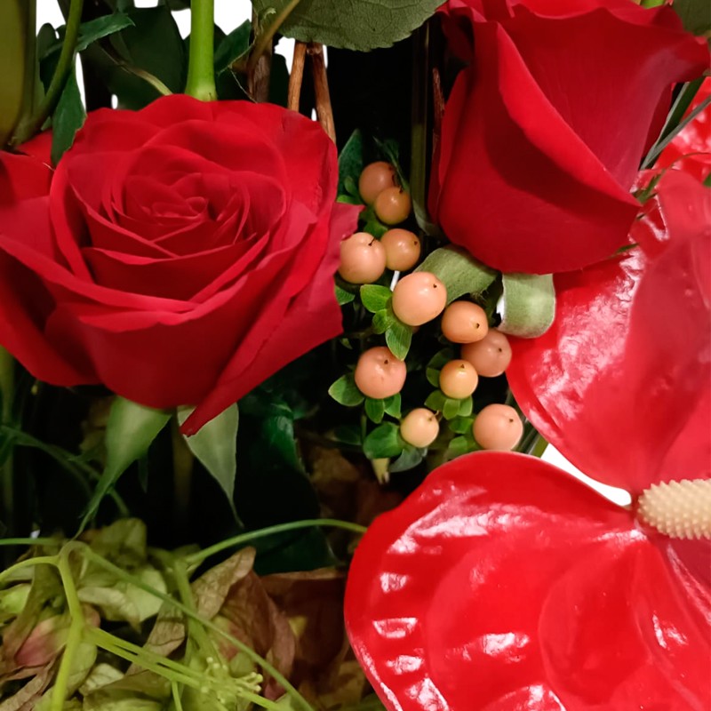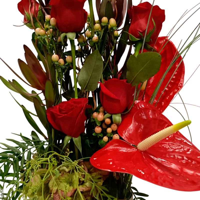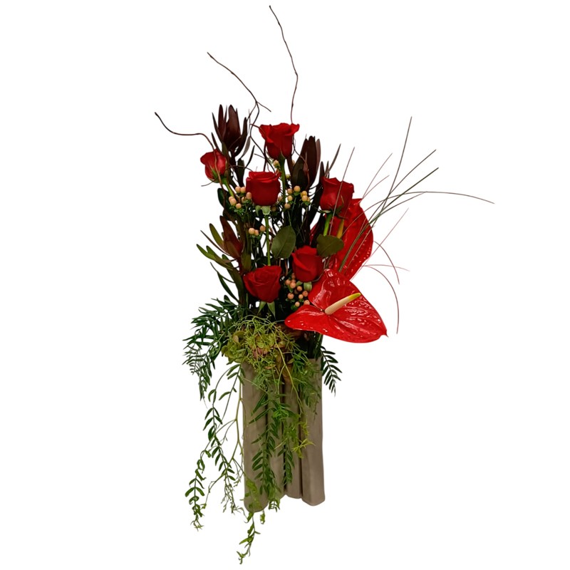 Original y moderna composición floral sobre un recipiente de diseño, elaborada con rosas, anthurium, hypericum y una cuidada selección de verdes. Una propuesta creativa que aporta un aire contemporáneo a cualquier ambiente.