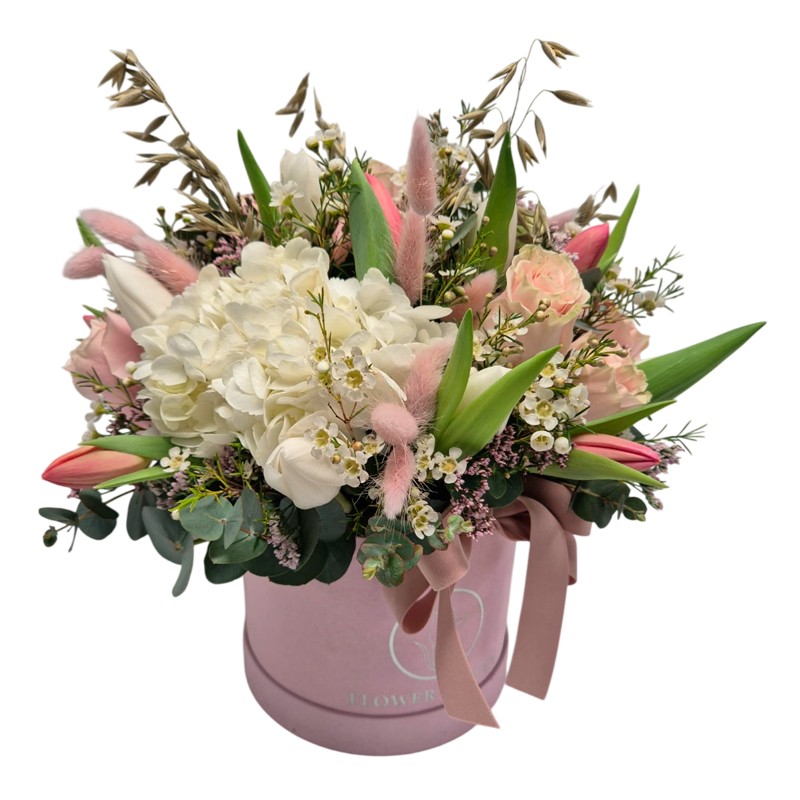 Elegante sombrerera de terciopelo que alberga una delicada composición floral en tonos blancos y rosados, formada por hortensias, tulipanes y rosas, acompañadas de sutiles flores secas. La combinación de texturas y matices aporta un aire contemporáneo y sofisticado, dando lugar a un conjunto armonioso que transmite dulzura, romanticismo y refinamiento.