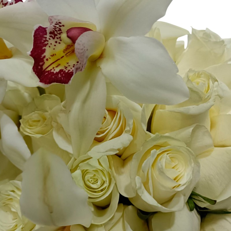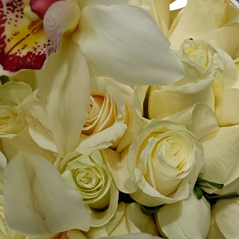 Exuberante y lujosa sombrerera floral elaborada con 100 rosas blancas de calidad premium y orquídeas cymbidium. Una composición de gran elegancia que transmite clase, estilo y distinción.