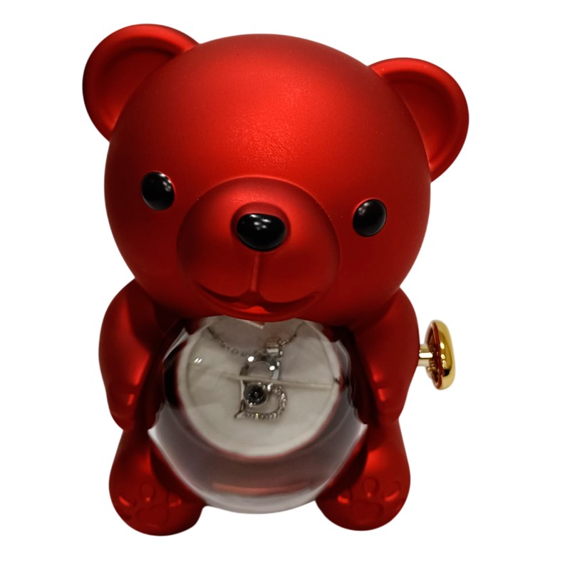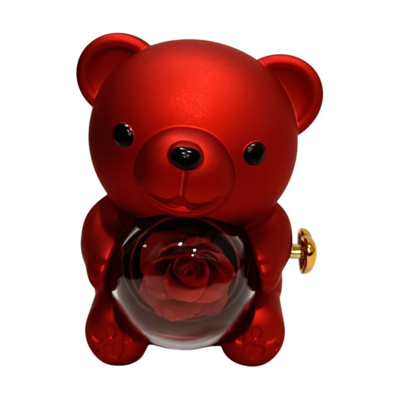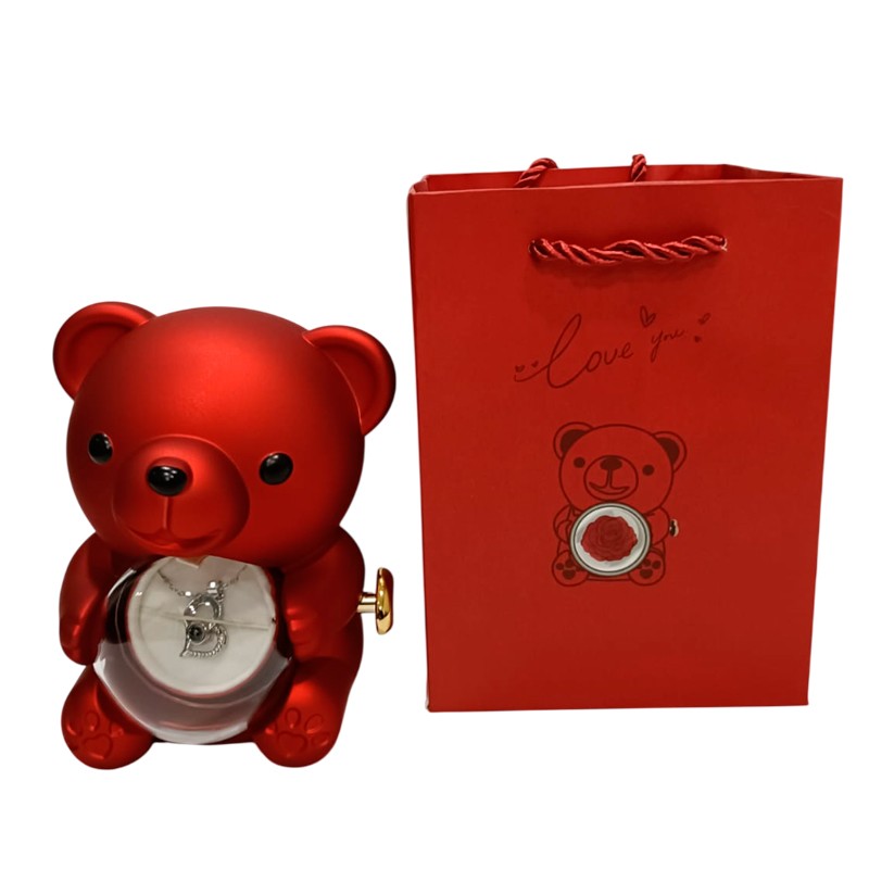 Figura de oso de 12 cm de altura que integra una rosa preservada y un colgante, presentada en una bolsa decorativa. Al girar la rosa, aparece el colgante. El diseño combina la durabilidad de la flor con un elemento de joyería, ofreciendo una forma diferente de transmitir amor y cariño hacia la persona destinataria.