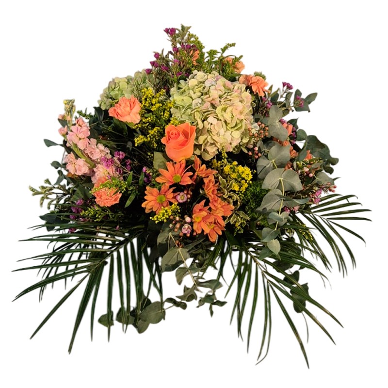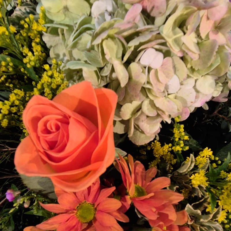 Arreglo floral de diseño compacto compuesto por una combinación de hortensias, rosas de tallo corto, margaritas y varas de solidago. La composición se integra con follaje verde ornamental seleccionado para aportar volumen y contraste cromático. Este centro destaca por su diversidad de texturas y una paleta de colores vibrante, diseñado para su ubicación en espacios interiores.
