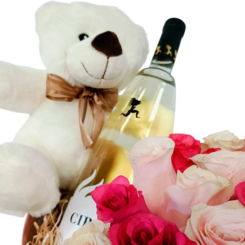 Composición en forma de corazón que integra rosas seleccionadas en una degradación de tonalidades rosadas, simbolizando la delicadeza y el amor en todas sus facetas. Se complementa con un peluche de textura suave y una botella de vino blanco verdejo Circe. Una propuesta armoniosa y detallista, ideal para expresar sentimientos profundos a través de una experiencia que combina lo visual, lo afectivo y lo sensorial.