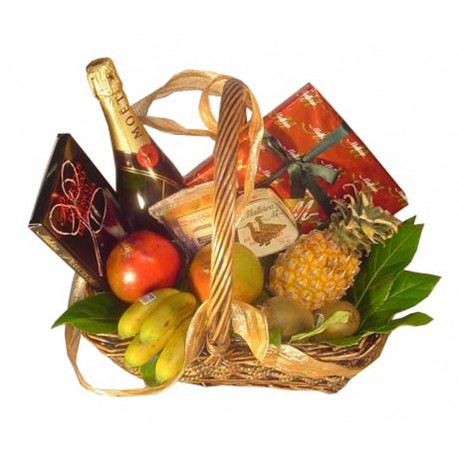 Excelente cesta de frutas acompañada con productos de altísima calidad como Champán Frances Moet & Chandon, jamón ibérico al corte, Queso italiano parmesano, bombones, foie y frutas tropicales.