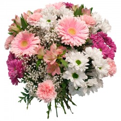 Ramo de flores variadas de tonos malvas, rosas, y blancos, que incluye margaritas, gerberas, claveles y astromelias, presentado con paniculata y verdes variados.