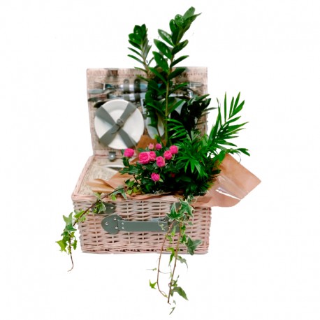 Cesta completa para picnic con cubiertos, platos, vasos y depósito de botella acompañada por una selección de plantas tales como chamadorea, zamioculca, rosal y hiedra. Un completo regalo para todos los públicos.