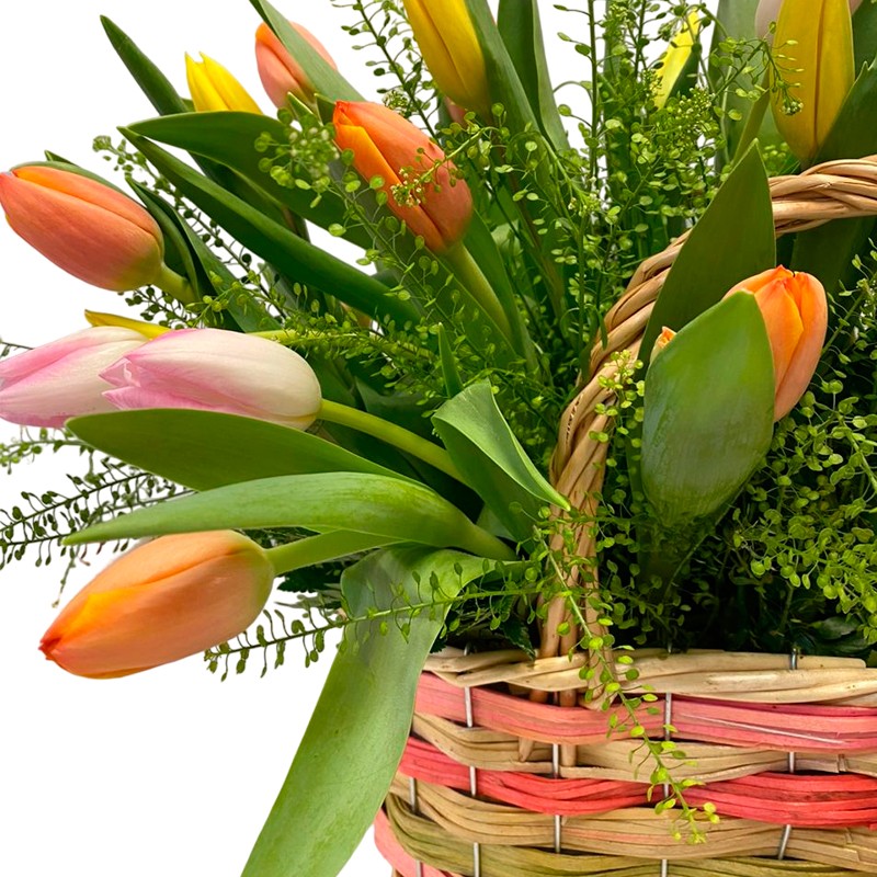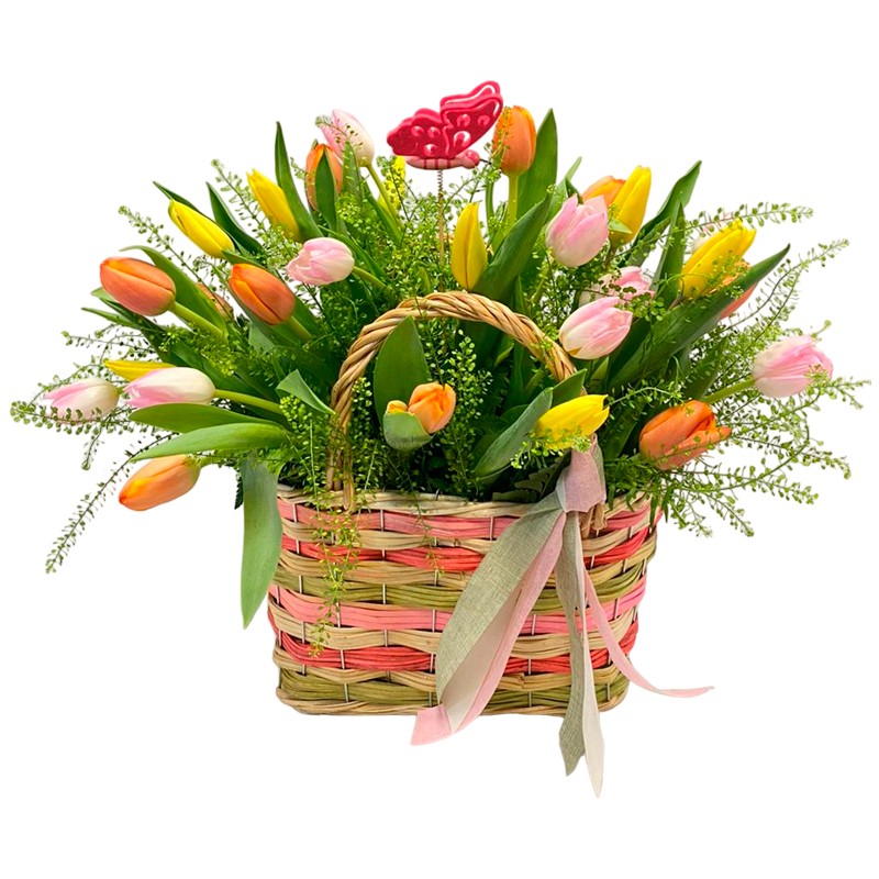 Preciosa cesta (modelo según existencias), compuesta por tulipanes de varias tonalidades acompañados por vedes decorativos, incluye un pic de mariposa. Una colorida composición que llenara de vida y color a cualquier ambiente.