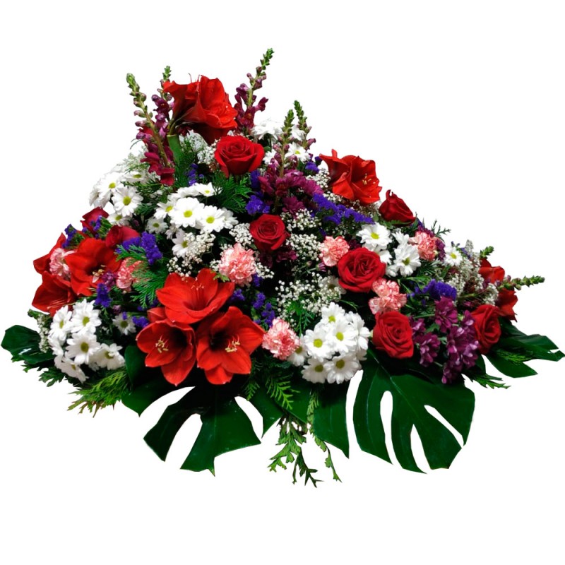 Centro de flores compuesto por flores tales como rosas, margaritas, claveles, antirium, paniculata estatic, etc y diversos verdes. Incluye cinta con dedicatoria personalizada para un máximo de 60 caracteres de texto.