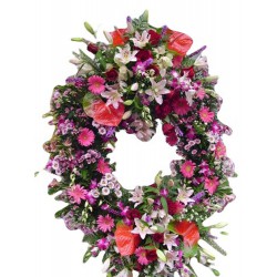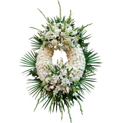 Espectacular composición floral con el escudo con la bandera de España compuesto por claveles rojos y margaritas amarillas. Medidas aproximadas 90x60cm.