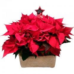 Impresionante composición de poinsettias presentada sobre una base decorativa, acompañada de elegantes ramas doradas y un encantador pic de Papá Noel. Una creación colorida y alegre, perfecta para desear una feliz Navidad y llenar cualquier espacio de espíritu festivo.