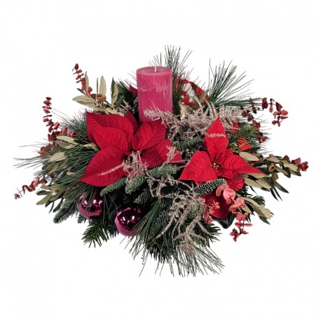 El Centro de Navidad Magenta Noël fusiona elegancia y originalidad con una combinación poco convencional de tonos magenta y detalles naturales. Este arreglo está compuesto por brillantes flores de Pascua rojas, una vela central magenta que aporta un toque cálido e innovador, ramas de pinsapo natural, eucalipto rosa y esferas navideñas que reflejan la luz con un brillo festivo. Su diseño equilibrado destaca por su mezcla de texturas y colores, creando un impacto visual único que rompe con lo tradicional. Ideal para decorar mesas, recibidores o espacios especiales, este centro no solo adorna, sino que eleva la atmósfera navideña con un estilo moderno y encantador.