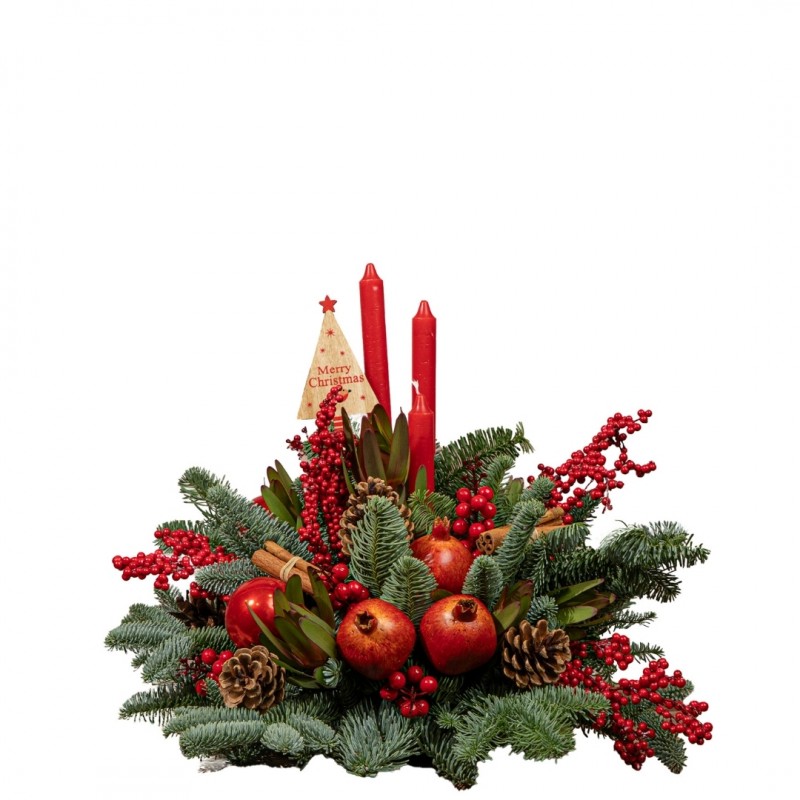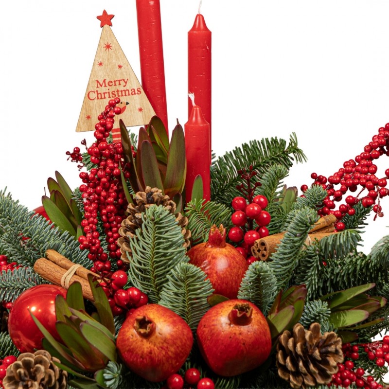 Un precioso centro navideño en intensos tonos rojos, perfecto para decorar la mesa de Navidad o dar un toque festivo a cualquier rincón del hogar. Elaborado con ramas de abeto, ilex, piñas, canela y granadas artificiales, incorpora además tres velas decorativas que aportan una luz cálida y acogedora.
