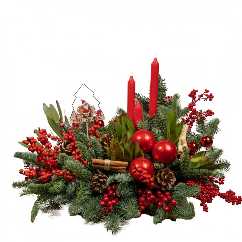 Un precioso centro navideño de forma ovalada en los clásicos tonos rojos y verdes, elaborado con velas decorativas, ilex, canela, piñas, bolas navideñas y un elegante pick festivo.