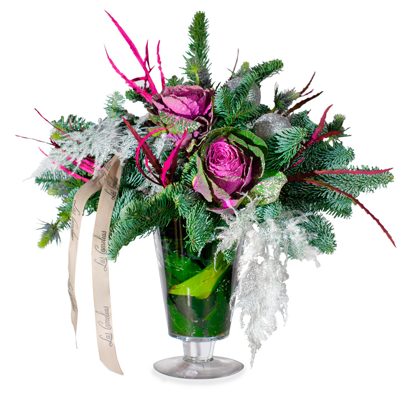Jarrón de flores navideños en tonos blancos, verdes y morados