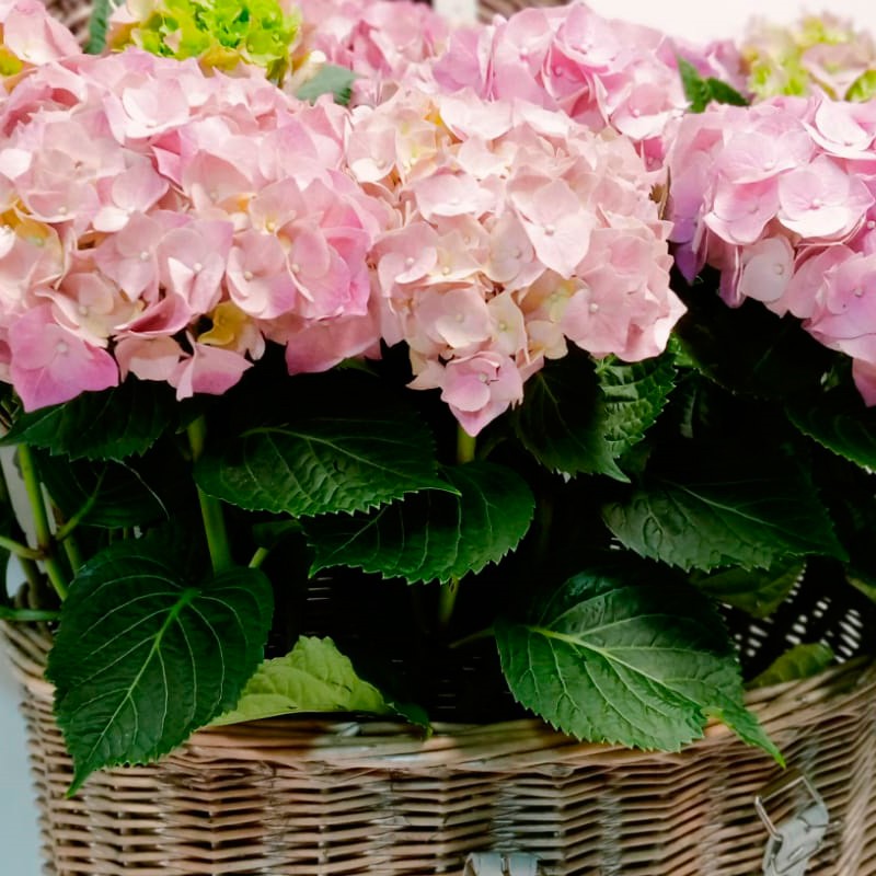 Espectacular cofre de mimbre de estilo vintage acompañado por 2 plantas de hortensias de color rosa (tonalidad dependiendo de stock).