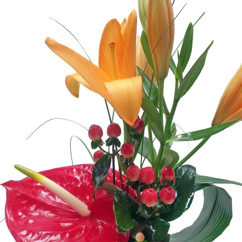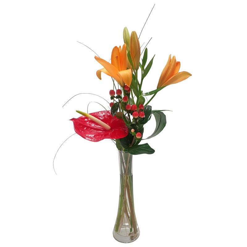 Pequeña composición en jarrón de con flores en tonos cálidos.