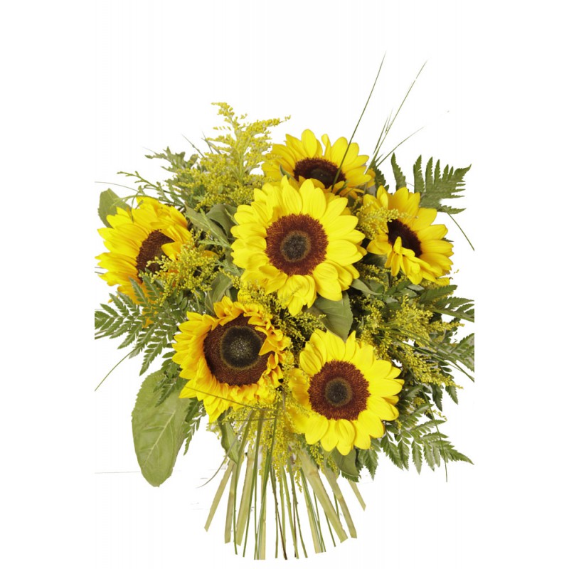 Precioso ramo de girasoles acompañado con solidago, es un ramo original y muy agradable de contemplar, su duración es media, necesita estar siempre con agua limpia y fresca para su máxima duración, este producto se presenta en tres tamaños, pequeño 6 girasoles, mediano 12 girasoles y grande 18 girasoles.