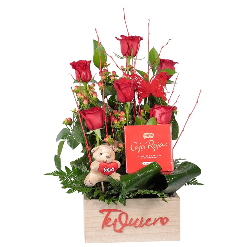Elegante composición con 6 rosas rojas de calidad extra, hypericum y verdes variados, acompañada de un oso amoroso, caja de bombones y un detalle de mariposa. Presentada sobre una caja de madera con la inscripción "Te quiero", es el regalo perfecto para expresar amor y cariño de una manera especial. Rosas disponibles en color Rojo, Rosa, Blanco y Amarillo. (*Por defecto seleccionado color ROJO).